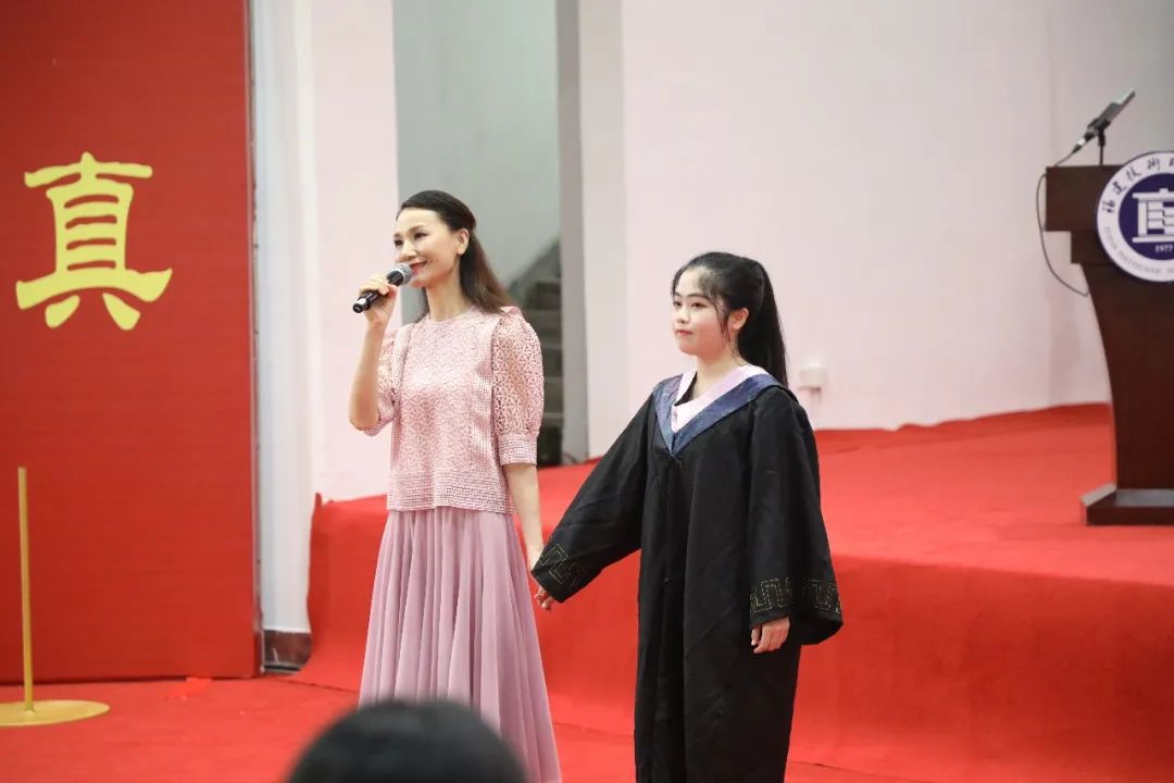 福建师范大学副校长陈庆华教授代表福建师范大学向顺利完成学业的原福清分校毕业生致以热烈祝贺和美好祝愿。他指出,同学们兼具福建师范大学和福建技术师范学院的双重校友身份,见证了一衣带水、永续不断的两校情缘。福建师范大学始终关心关注着大家的成长,也将目送着大家走向更高更广阔的舞台。他向毕业生提出了三点希望。一要立大志,仰望星空逐梦;二要下苦功,脚踏实地拼搏;三要善创新,永立潮头争先。他同时还以“和道德孝忠勇节义,荣耻悔悯福安亏曲,守正创新无愧时代,内慧外秀安康幸福”相赠毕业生,为大家送出美好祝福。