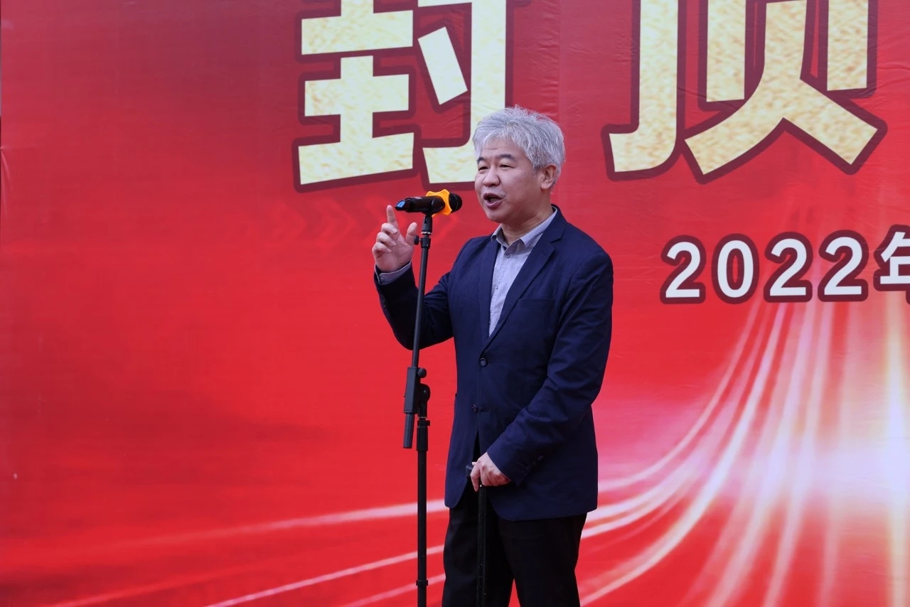 廖深基校长代表学校,再次向捐建林联兴科技楼的印尼融籍侨领林联兴博士表示衷心的感谢和诚挚的祝福。他指出,林联兴科技楼项目的落地和封顶,充分体现了福清市委市政府、融籍海外乡亲、社会各界对我校事业发展的关心支持,充分展示了全体师生凝心聚力共促发展的喜人成果。他希望施工单位保持干劲、安全施工,努力把林联兴科技楼工程打造成为品质优良的放心工程、精品工程。他同时希望全体干部师生持续保持奋发有为、真抓实干的精神状态,奋力建设一流应用型大学,为谱写全面建设社会主义现代化国家福建篇章作出新的更大贡献。